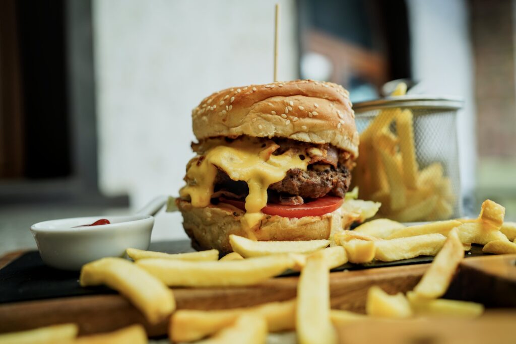 (juneće meso, marmelada luk, burger sos, gauda, čedar sos, paradajz, kiseli krastavci, slanina, pomfrit)