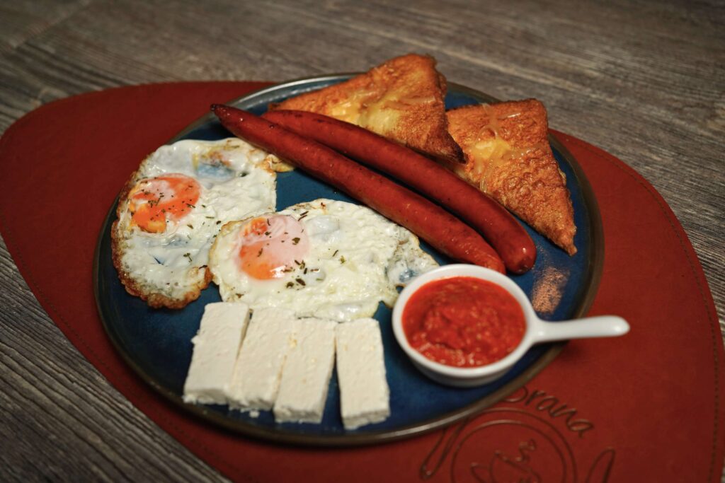 (dva jaja na oko, 2 kobasice, prženice, ajvar, sir)